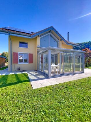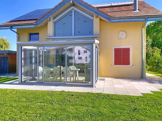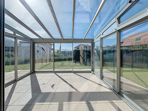 La véranda, tournée vers le jardin arborisé, constitue un véritable lieu de détente en toute saison.